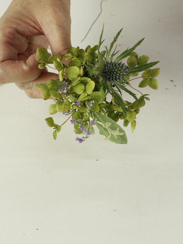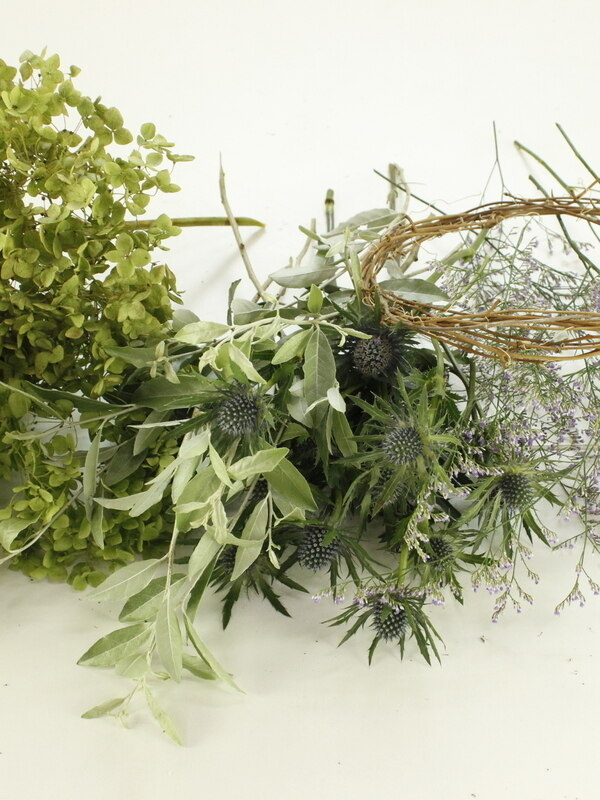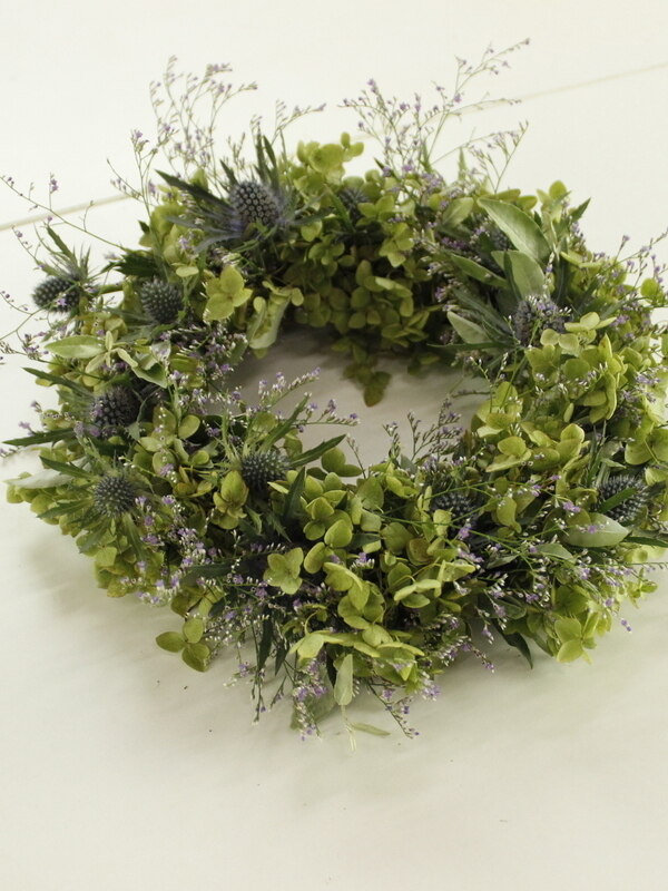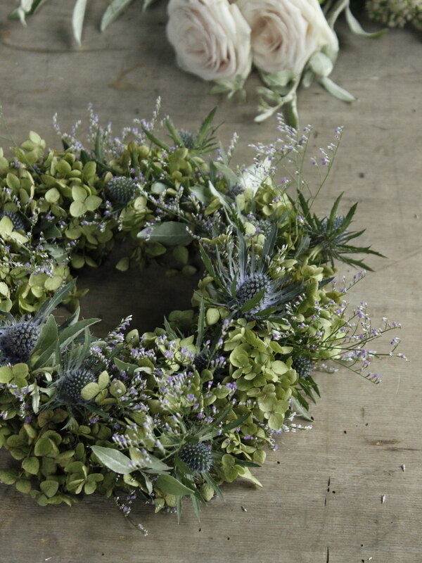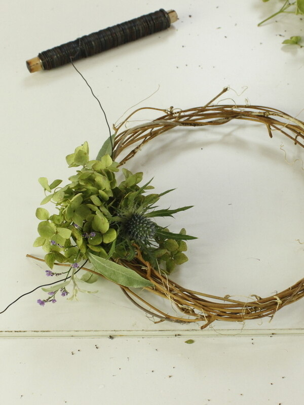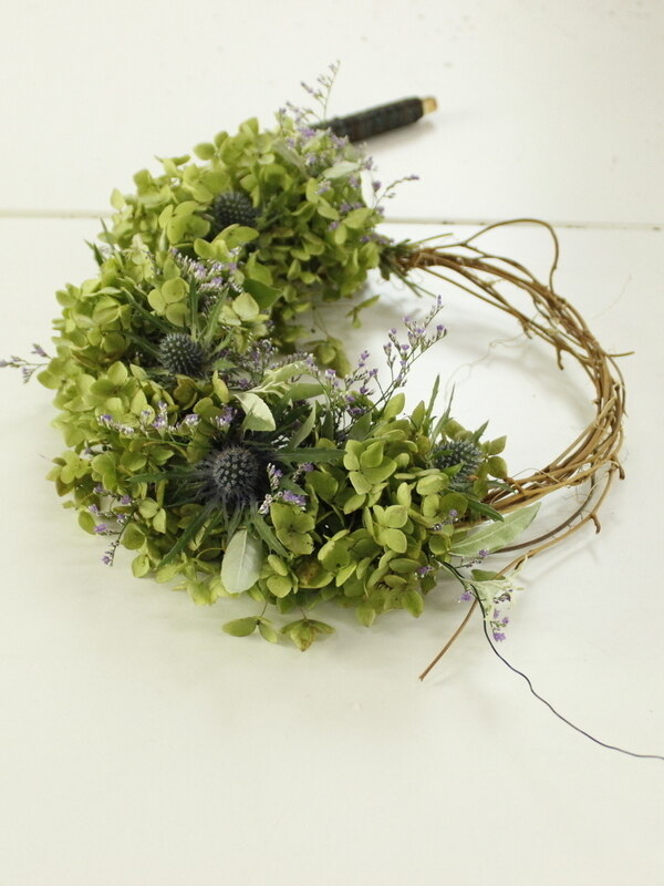近藤しょうこ先生のうきうき花レシピデザイン。レシピはこちら。アンティークアナベルをつかったユル編みのリース。細めのリースベースに、透け感を残しつつざっくりとお花をつけていきます。