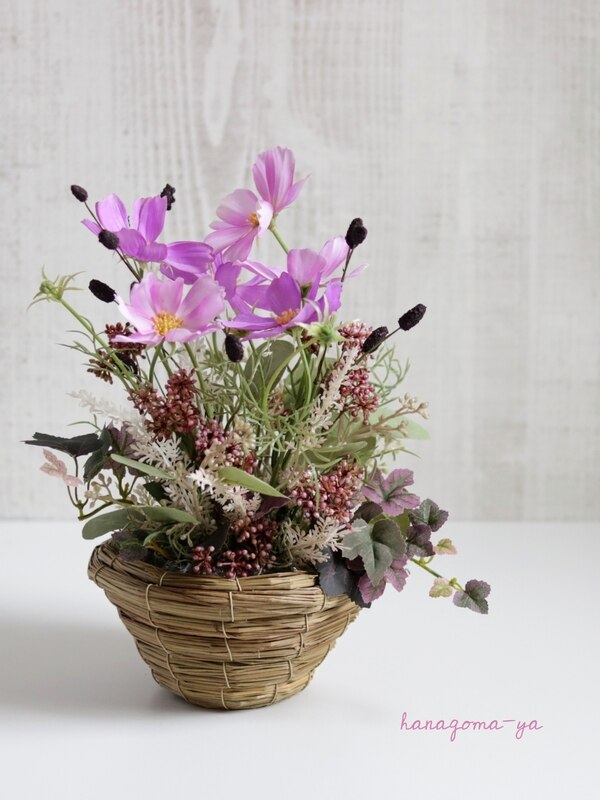 アジアンテイストのバスケットは和洋どちらのインテリアにも馴染む万能選手です。コスモスとナチュラルな草花で秋の始まりを感じるアレンジに。