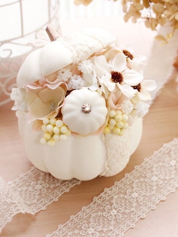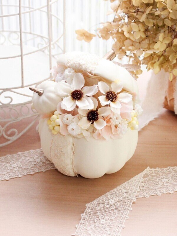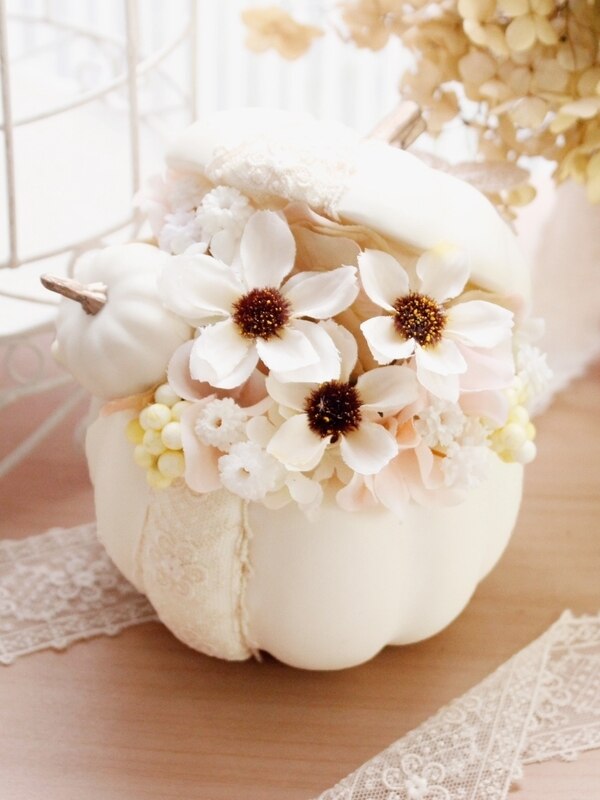 手のひらサイズのパンプキンを使ったアレンジメント。ホワイトをベースに小花やベリー、コスモスを使って柔らかい色合いに仕上げています。パンプキンにあしらう花柄のレースがアクセントです。