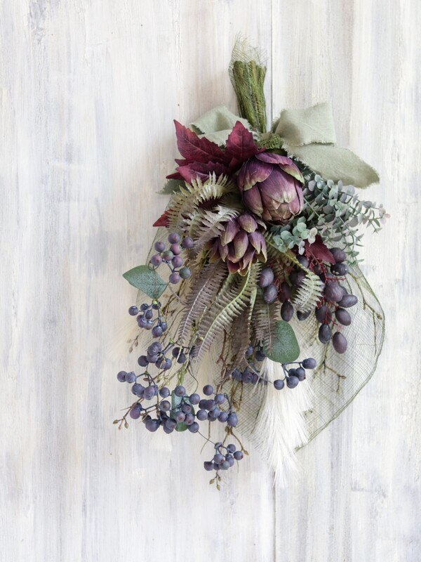 パープルのグラデーションで深まる秋を感じるスワッグです。シダとファーンで動きを付けてナチュラルな印象に。