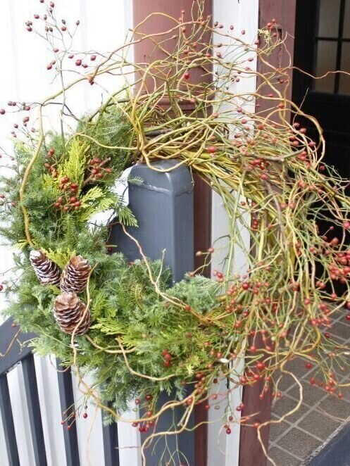 隙間の空いたざっくり編みのリースも海外のインテリアではよく見かけます。ドラゴン柳と野バラの枝でナチュラルな土台を作りあえて埋め尽くさない程度にコニファーを巻いて完成させます。