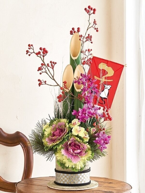 今回は華やか葉牡丹の門松飾り。青竹の門松飾りを葉牡丹・蘭・赤い実で飾り付け!仕上げに干支凧を添えれば玄関飾りにぴったり♪