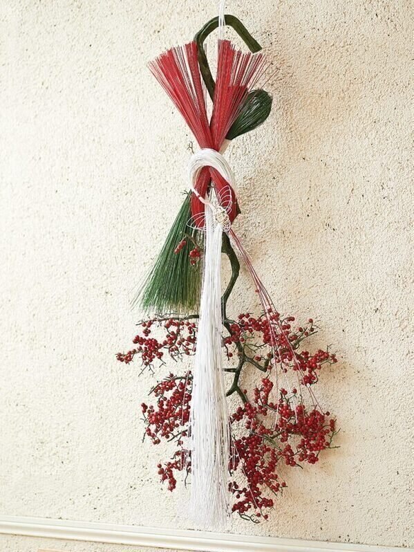 今回は紅白水引のベリーハンギング。大きな赤い実の枝に紅白水引を結び、さらに鶴細工をあしらいお正月気分♪