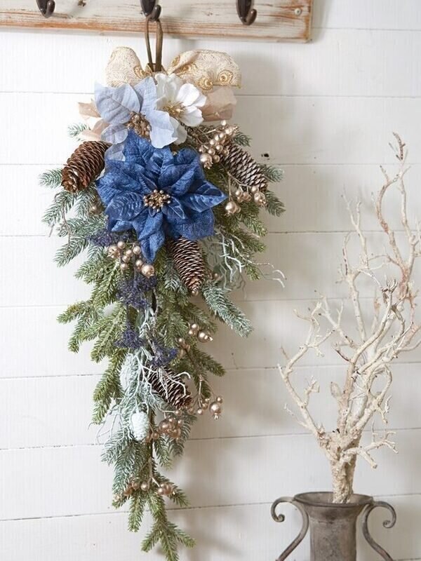 今回はブルーのクリスマスドロップスワッグ。人気のスワッグにブルーの花材をプラスして、自分だけのアレンジに!。
