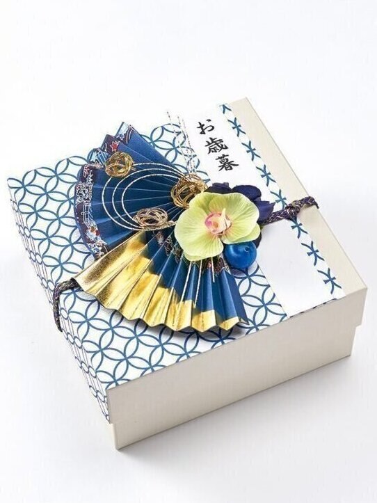 ジャパン・ブルーの和柄紙と造花でいつものギフトをランクアップ。お好きな熨斗やメッセージカードを付ければ季節問わず使えますね♪