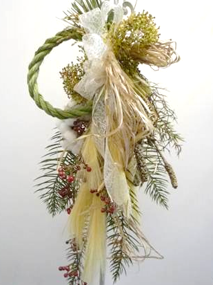 ドライルックの造花をしめ縄飾りに仕上げました。