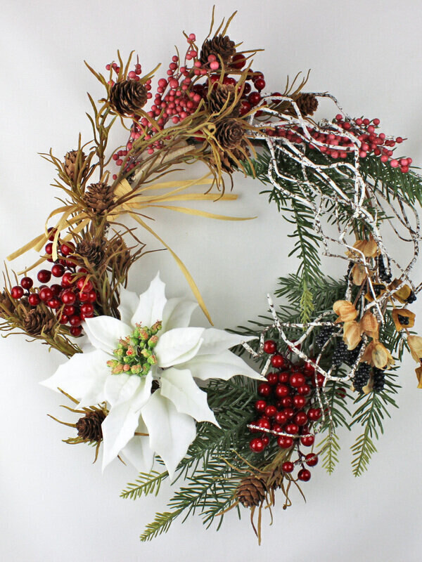 クリスマスをメインのイメージにしていますが、花材や色味にこだわりました。秋からクリスマス、ポインセチアを外せば冬の間もずっと飾れるナチュラルで立体的なリースです!詳しい作り方: https://www.hanadonya.com/magazine/hanarecipe/artificialflower/18530.html
