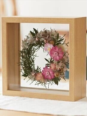 【大地農園作品例】永遠を意味するリースをフレームの中に作りました。ブルーアイスの繊細な葉とピンクのジニアが可愛らしいリースです。フレームの中に入っているので、長い間楽しめるのでギフトにも。