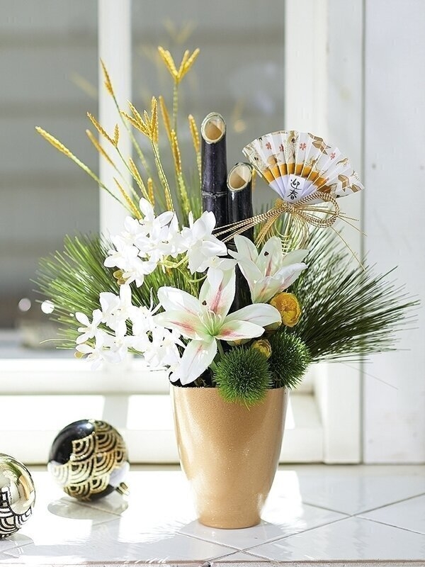 白いリリー&ファレノと黒松でシックなお正月アレンジに。