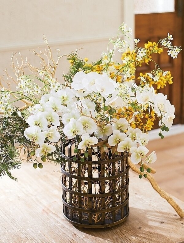 早春を感じさせるファレノとレンギョウをアンティークなランタンにアレンジ。