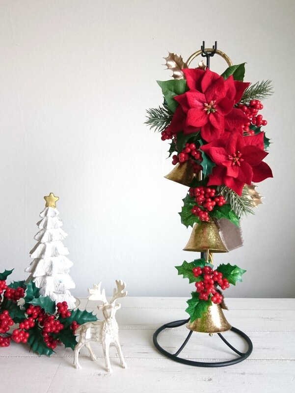 クリスマスの王道ポインセチアにパインとホリーをくわえ、三連のクリスマスベルと合わせました。ポインセチアはあまり大きすぎず、扱いやすいサイズで、質感も上品で可愛いです。クリスマスの王道的なオーナメントに仕上がりました。