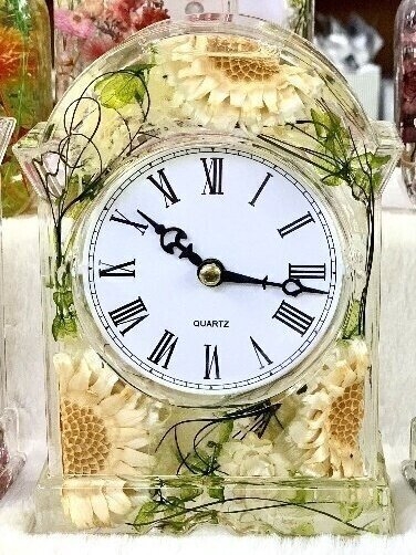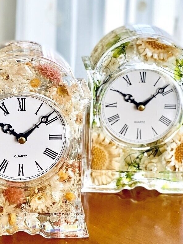 大ぶりのコンパクタを使用した、ナチュラルテイストが可愛い花時計♪。【詳しい作り方】「ハーバリウム フラワークロック」の作り方・要注意ポイントの解説。【ハーバリウムオイルで作る場合】資材セットとハーバリウムオイルが必要になります。●商品番号: 163-00006 即日★アクリルデザインケース用 資材セット(4点セット)●ハーバリウムオイル商品一覧