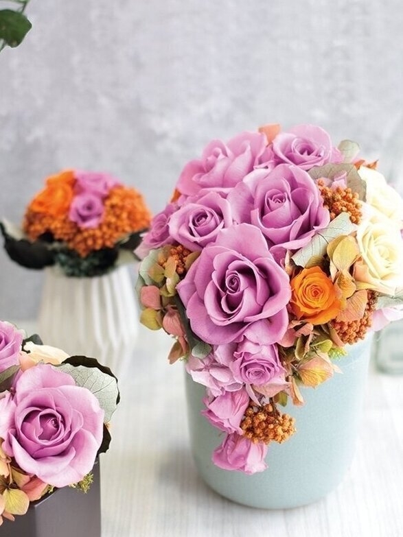 大人っぽい「ヘザーローズ」のカラーを主役にしたアレンジ。エクアドル産の良質なお花で作られたプリザーブドローズを使用しています。