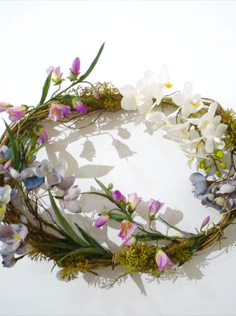 ブランチを丸めてリースに。オーキッドや春のフラワーで飾り付け♪