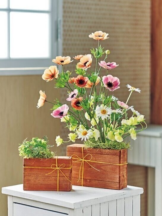 本型のベースがユニークなフラワーアレンジです。結んだ細いリボンがワンポイント!