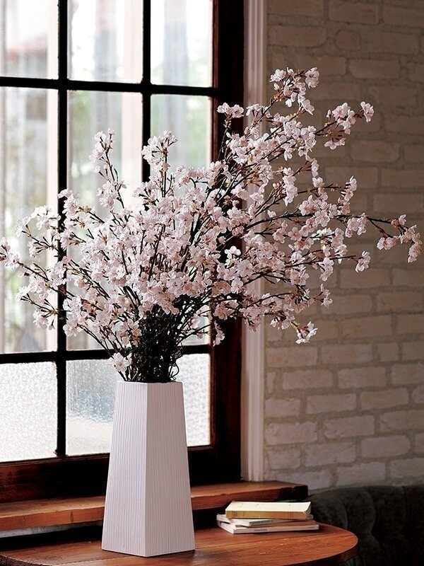 淡雪の桜をたっぷり使った投げ入れ風アレンジ。ツィッグスクエアベースを扇型に折り曲げ、花止めにします。枝が重ならないように放射線状に高低差を出して挿しています。