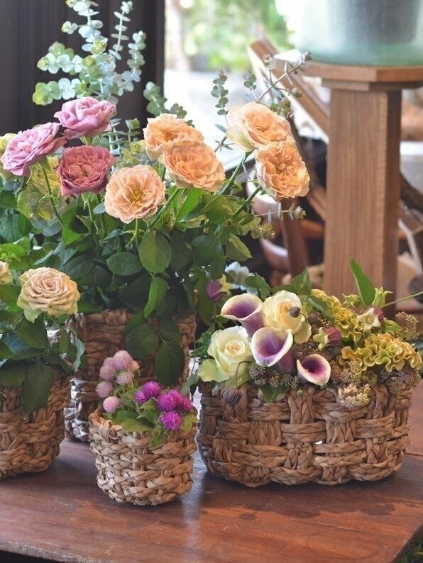 ざっくり編みのバスケット。バスケット自体の存在感があります。生花との相性がとても良く、おしゃれな雰囲気に仕上がります。お花はイメージとして類似品の掲載をさせて頂いています。