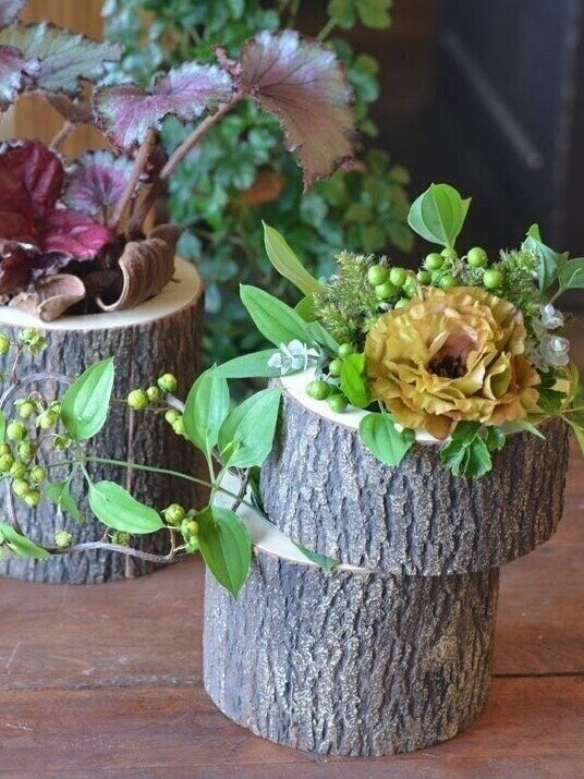 切り株のようなフラワーベースです。素材はウレタンに天然の木の皮が巻きつけてあります。ベースにはビニールがついていますので、生花対応OKです。お花はイメージとして類似品の掲載をさせて頂いています。