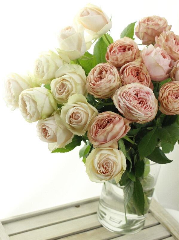 生花バラの色合わせ参考例。左マフィーユ。右ポルトボナー。※バラは入荷する季節、産地などにより花色や大きさの変化がございますのであくまで一例としてご参考になさってください。