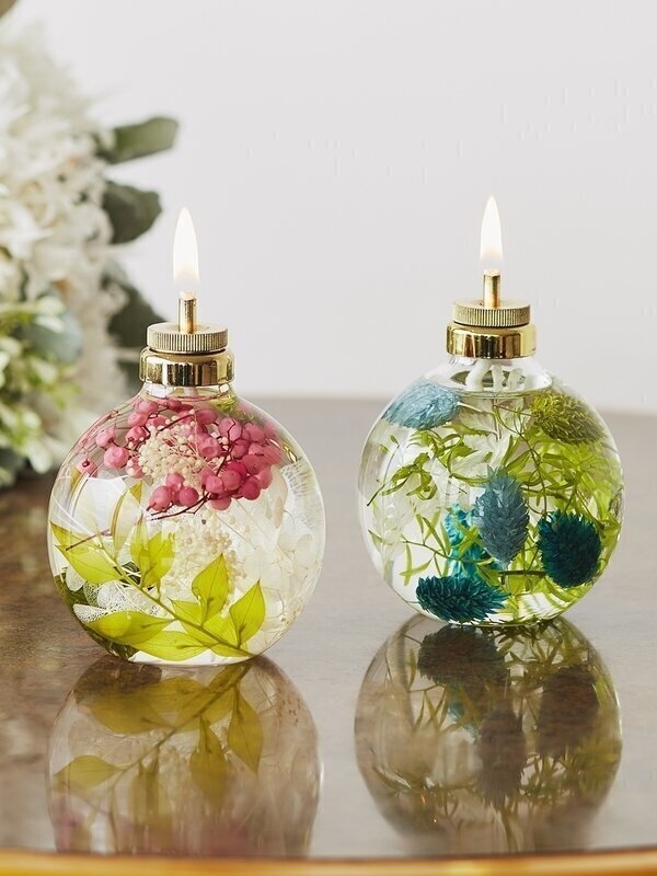 リキッドキャンドルの中にお花をレイアウトすると、素敵な「ハーバリウムランプ」が楽しめます♪