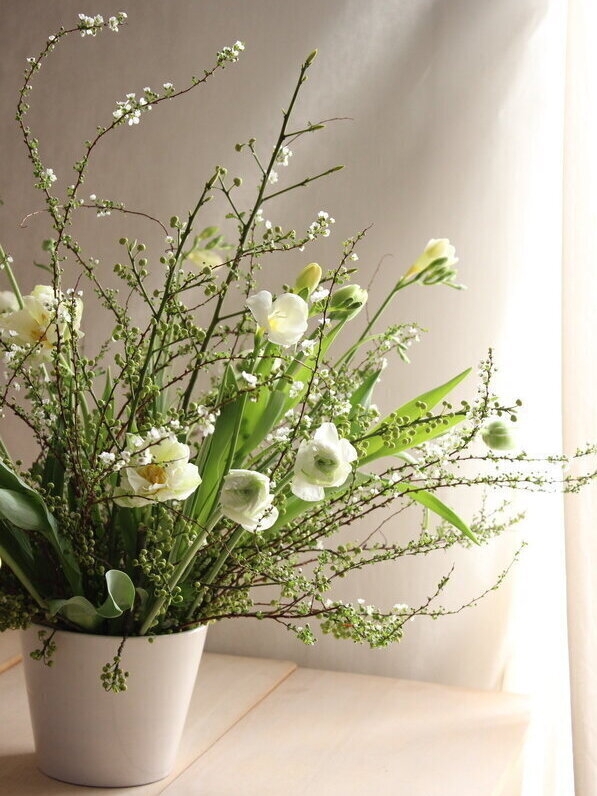 作り方はこちら。春の白い花を合わせた芽吹きのアレンジ