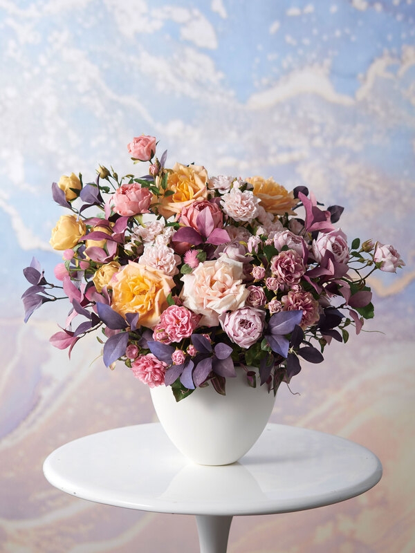 ローズ&パープルリーフが印象的な置きアレンジ。