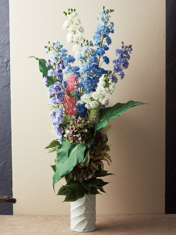 デルフィニウムの枝ぶりを生かしたタワー型アレンジ。