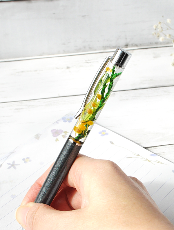 イエローのスターフラワーの蕾を使って、ミモザ風のハーバリウム・ボールペンを作りました。スターフラワーの束の中にある、花びらのない花を利用できないかと、デザインしてみました。可愛らしすぎない、大人のペンになってくれました。