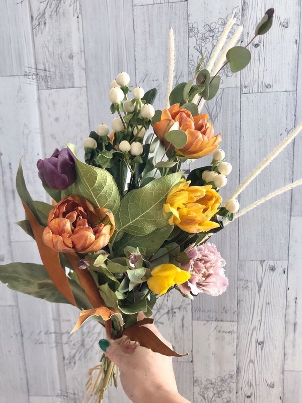 チューリップの花束。デザイン @df.foo (Instagram) 。※チューリップ以外の花材は類似品です。