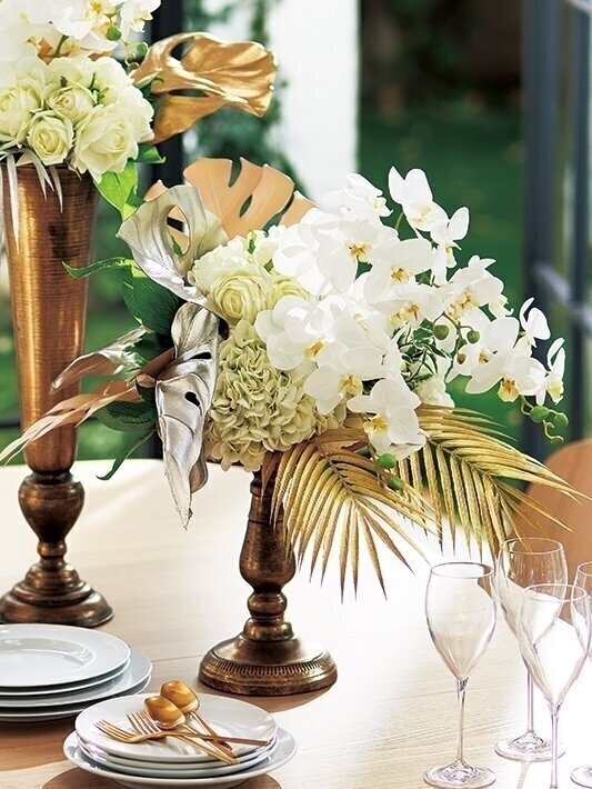 ゴールド&シルバーのリーフがモダンなファレノアレンジ。