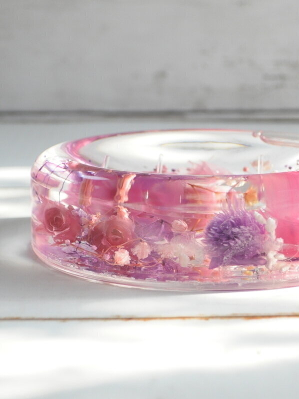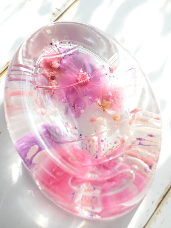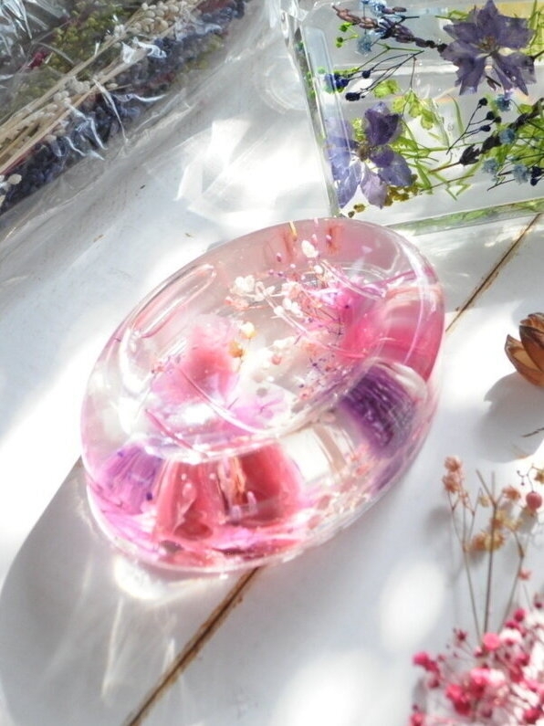 プリザーブドフラワーをメインに使用して、ハーバリウム・ソープディッシュを作りました。プリザーブドフラワーは、オイルが浸透すると、飴細工のように透き通ってくるので、全体が優しいピンクに包まれるフェミニンなディッシュに仕上がりました。お花が動いてしまわないように、UVレジンで固定しました。