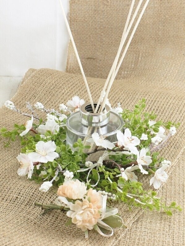 桜とグリーンでふんわりかわいらしい雰囲気に仕上げました。ナチュラルなやさしい色合いが春の訪れを感じさせてくれます。基本の花材は3種類!アーティフィシャルディフューザーとしてもリースとしても使えます♪。作り方:https://www.hanadonya.com/magazine/hanarecipe/20284.html