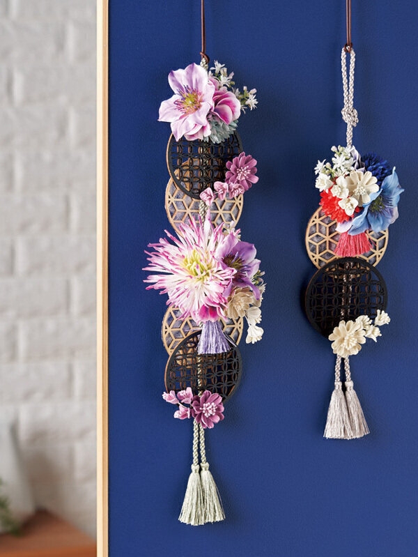 紋様プレートを使ったハンギングアレンジ。◎お写真左側のアレンジです。◎プレートにはこちらの包装紙を貼っています。
