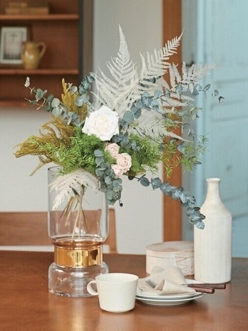 白が印象的なドライのナガシダにユーカリなどナチュラルな素材を合わせたアレンジです。