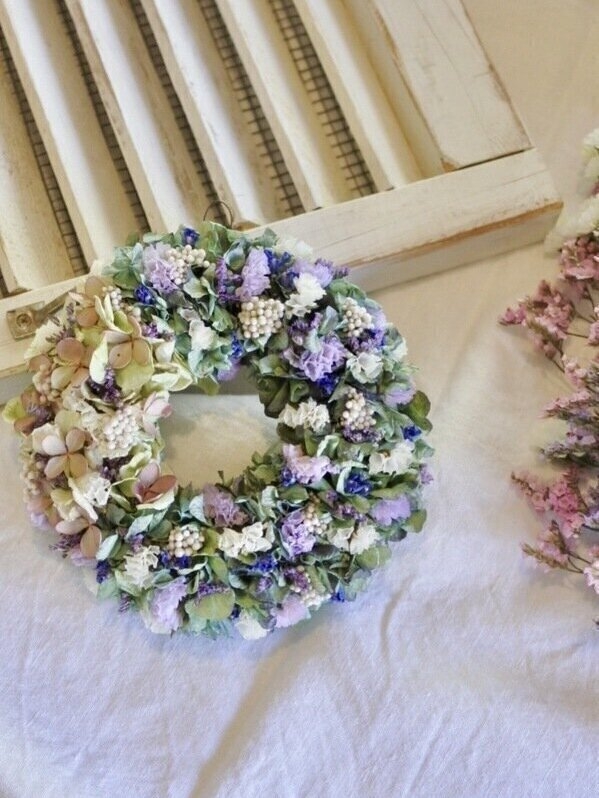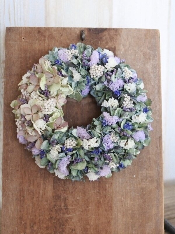 アンティークなブルーのアジサイを使ったリースです。暗くなり過ぎないように、一部分をアンティークグリーンのアジサイにし、スターチスやライスフラワーなどをプラスしました。