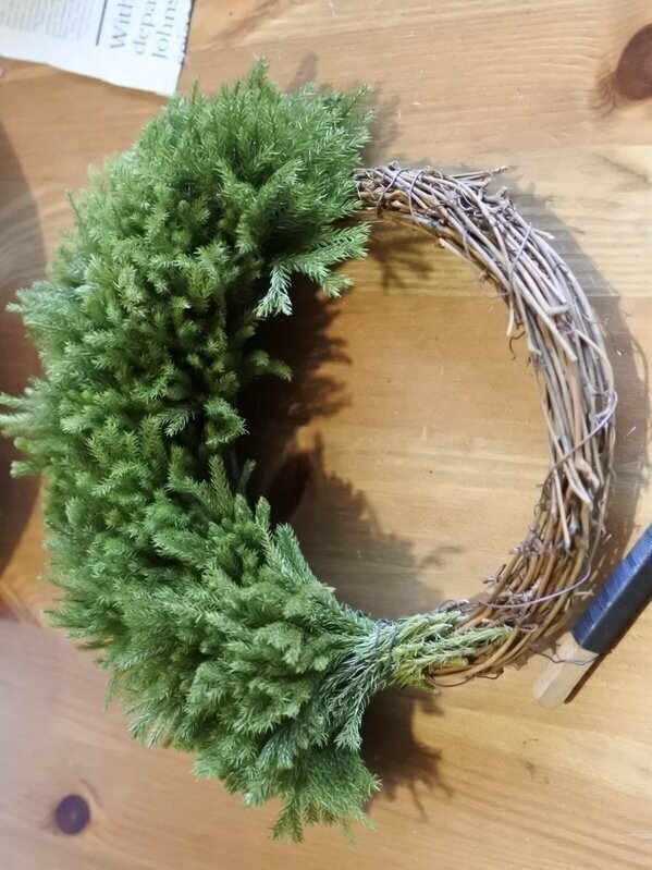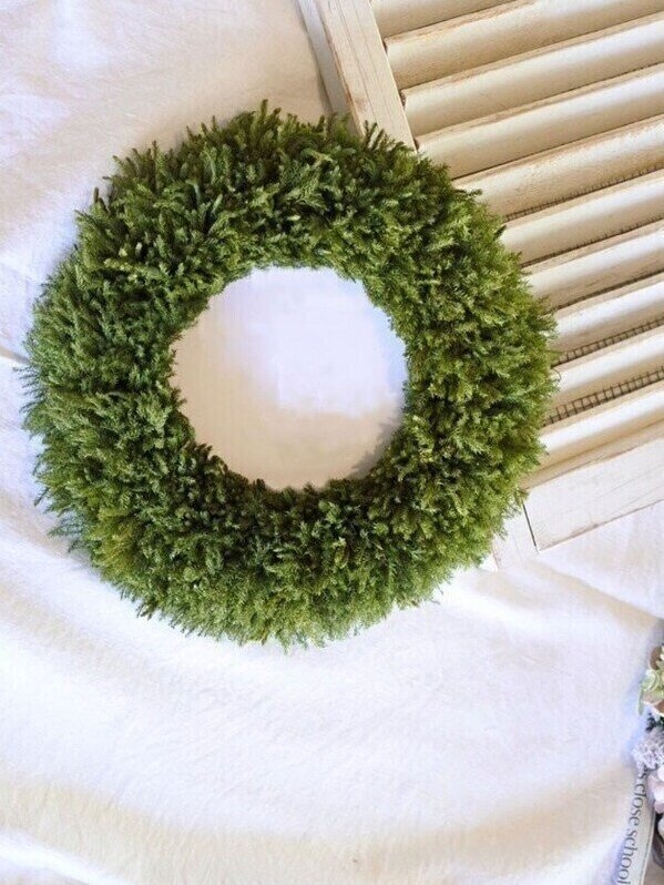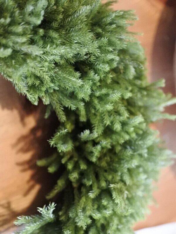 ヒカゲカズラのみのシンプルなリースです。見た目は杉に似ていますが、シダ植物で葉は柔らかいので作りやすい素材です。ドライになってもあまりポロポロしません。グリーンは徐々に明るめの茶色になり、アンティークな雰囲気で長く飾って頂けます。
