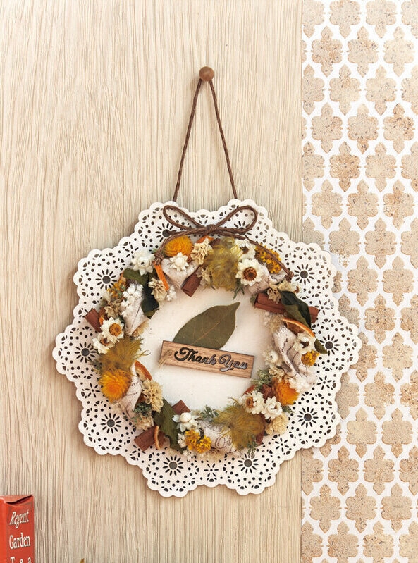 リース状にした花材をプレートにあしらって。