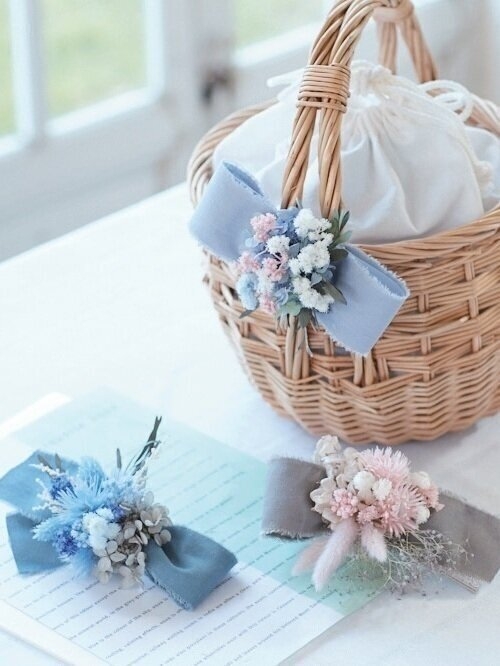 プリザーブド・ドライの小花をたっぷり使ったアレンジ。パステルカラーで優しい雰囲気の作品例です。