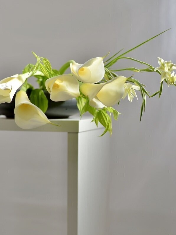 初夏のお花の楽しむカラーを横たわるように飾ります。少し高い位置に飾ることで、口の分を見て楽しむことができます。