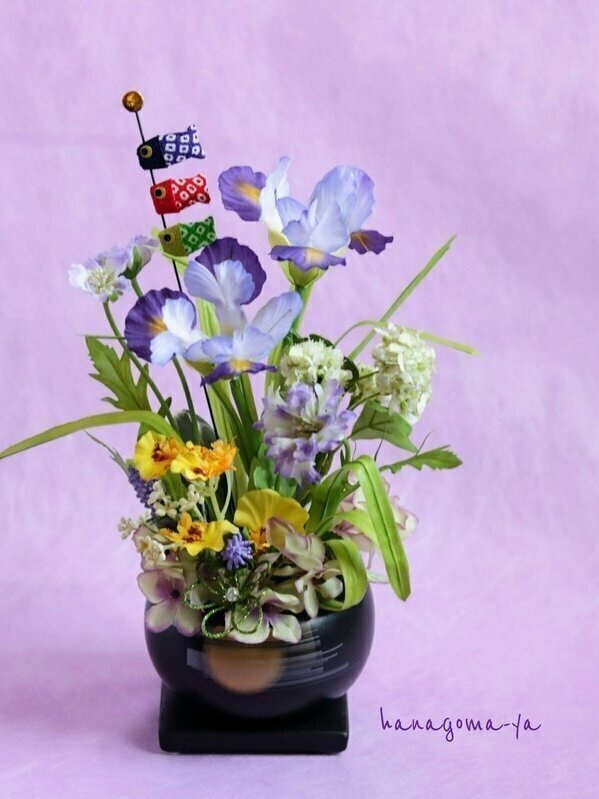 満月が描かれた黒の陶器花器にすっと伸びたアイリスが凛々しい雰囲気で端午の節句によく似合います。男の子の健やかな成長を願う鯉のぼりも立てて。小さめサイズで場所を取らずに飾っていただけます。。