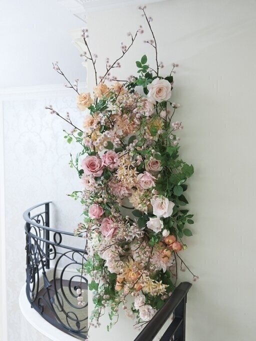 ピーチからライトピンクまで、優しいピンクの花で彩る壁掛け。