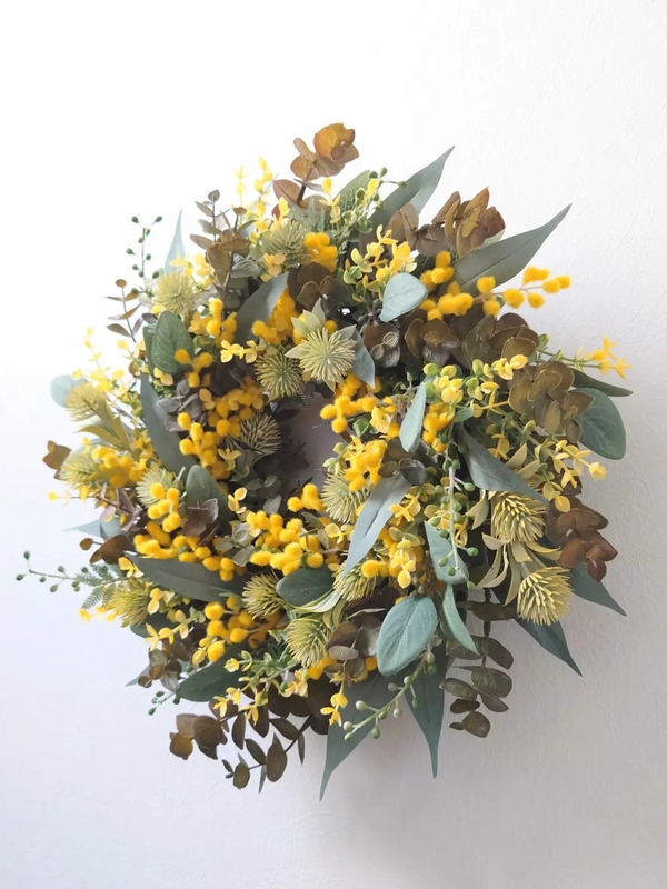 ユーカリとミモザは人気かつ定番の組み合わせですが、今回は大人っぽくアレンジしてみました。濃い色合いのジュアンユーカリが力強さを笹のようなバンブーユーカリが柔らかさを表現してくれます。黄色のミモザに黄色のタイムがよく合いますし、アザミもとってもよいスパイスになると思います。