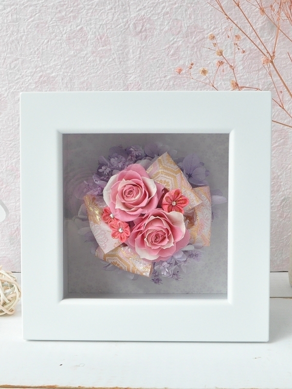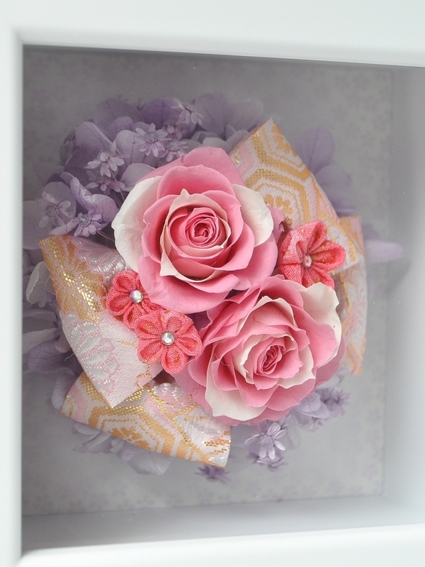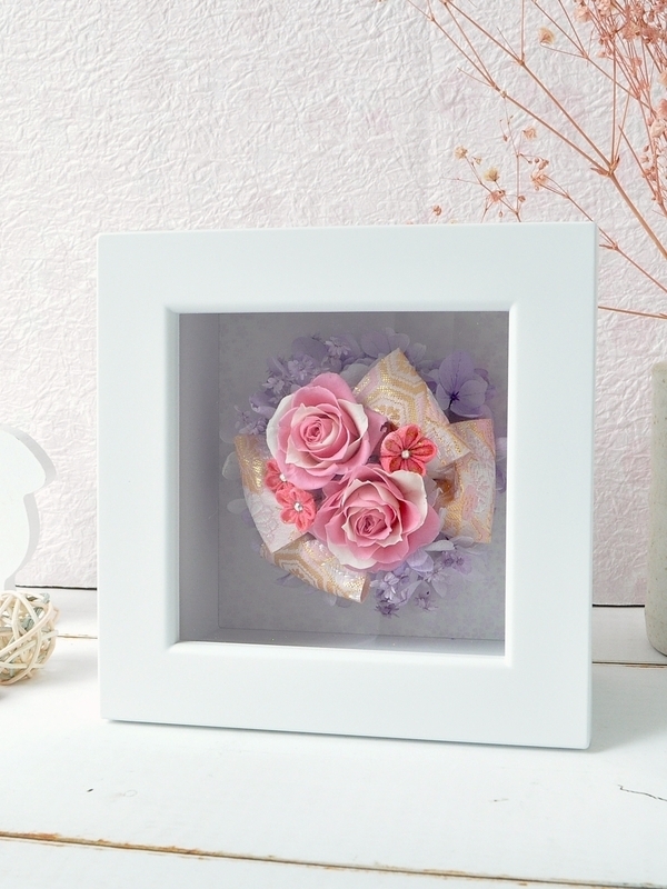 和風のリボンをあしらい、振袖の帯のように構成しました。フレームにはガラスが付いているので、プレゼントにぴったりです。(リボンは西陣織「花亀甲」です。現在、販売していないようです。)