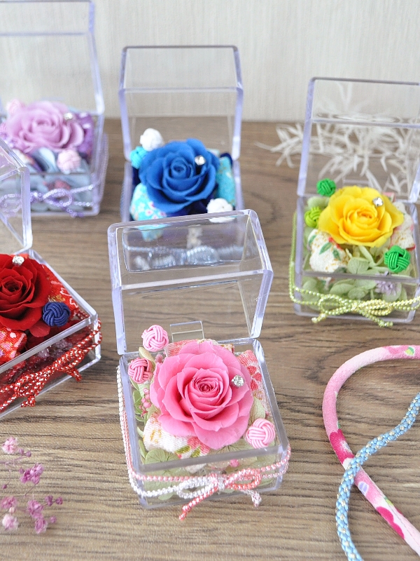ショップでは、プリザーブドフラワーを中心につまみ細工や水引、レジンなどで、お花モチーフの雑貨やアクセサリーを販売しています。