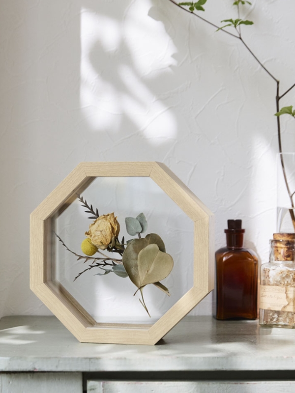 ガラス面にドライフラワーを挟んだフレームアレンジです。