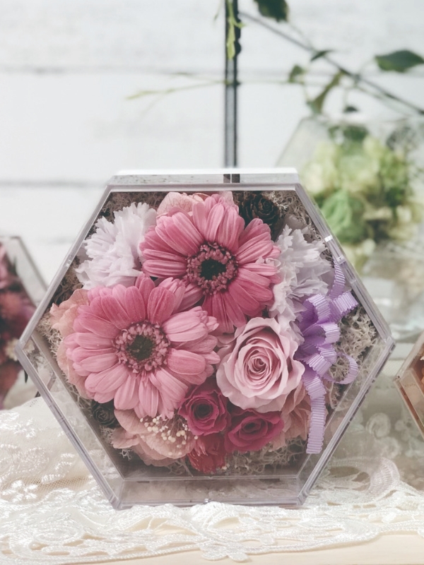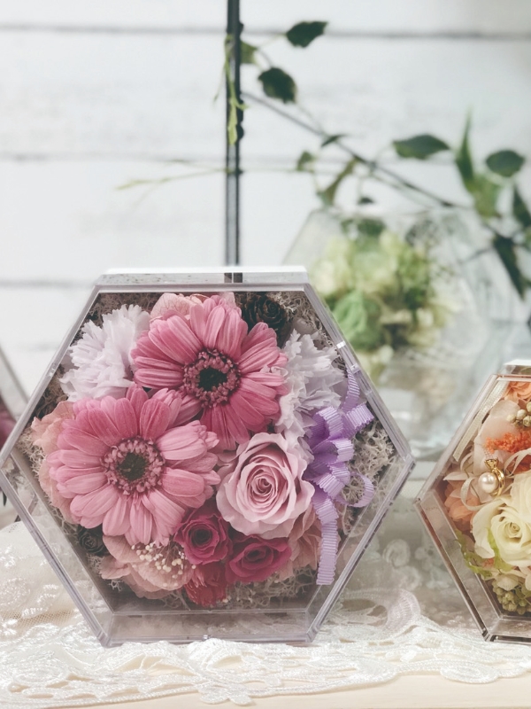 六角形が持つ特別な意味「愛情」「家族」「調和」「安定」「平和」「長寿」。特別な日に、ギフトケースとして使用することで、送り手の気持ちを伝えることの出来る、新コンセプトのフラワーケースです。