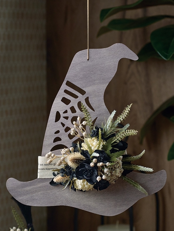 プレートにリボンを貼り、その上にグルーで材料を接着してアレンジしています。