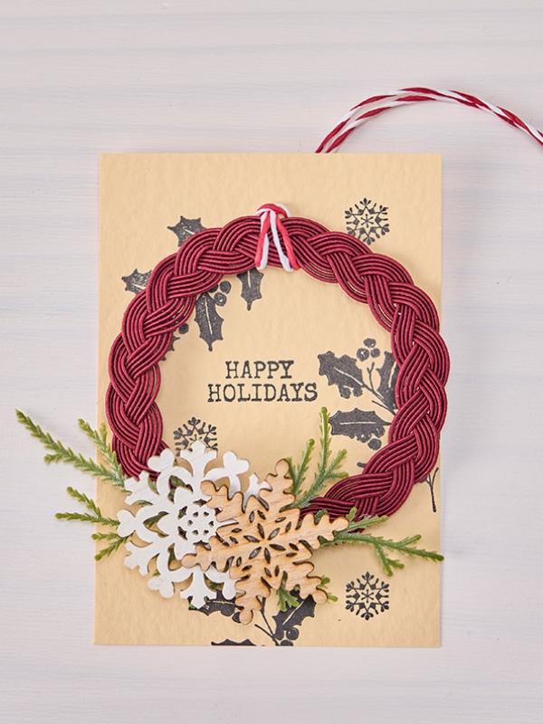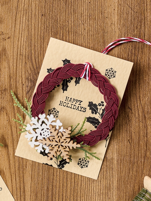 水引リングにパーツやグリーンを貼り、スタンプを押したカードを添えたオーナメントです。ちょっとしたギフトにもおすすめです。