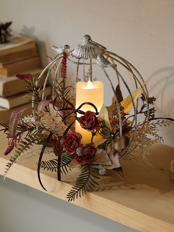 鳥かごの中にフォームを入れ、そこに花材をアレンジしています。フォームの上面はキャンドルを乗せる為空けています。