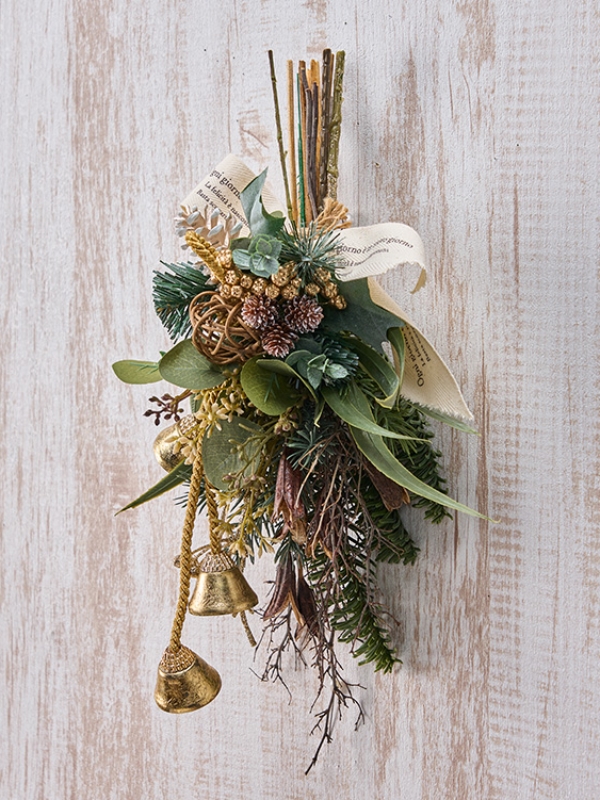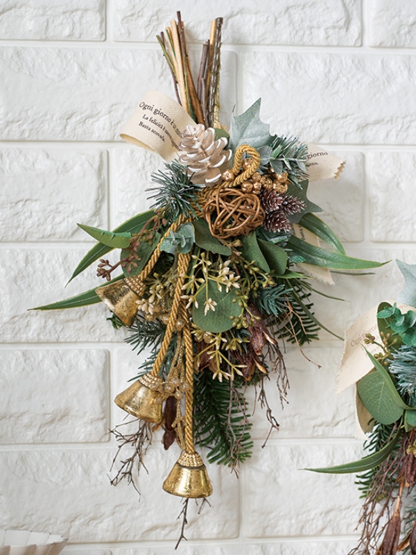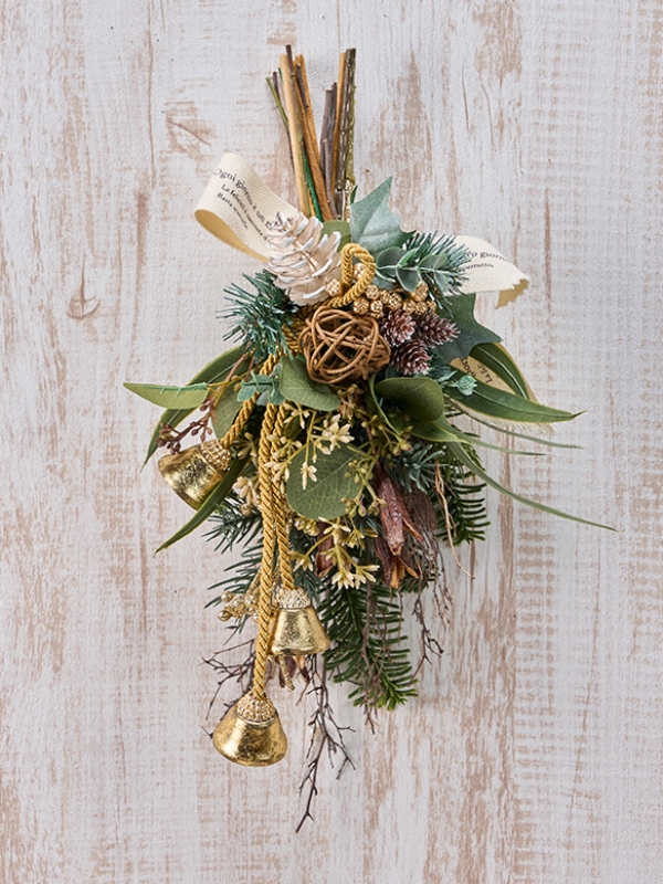 1/3にしたバンドルにドライの枝やピックなどを足して吊り下げのスワッグに束ねます。最後にベルとリボンを付けて仕上げています。